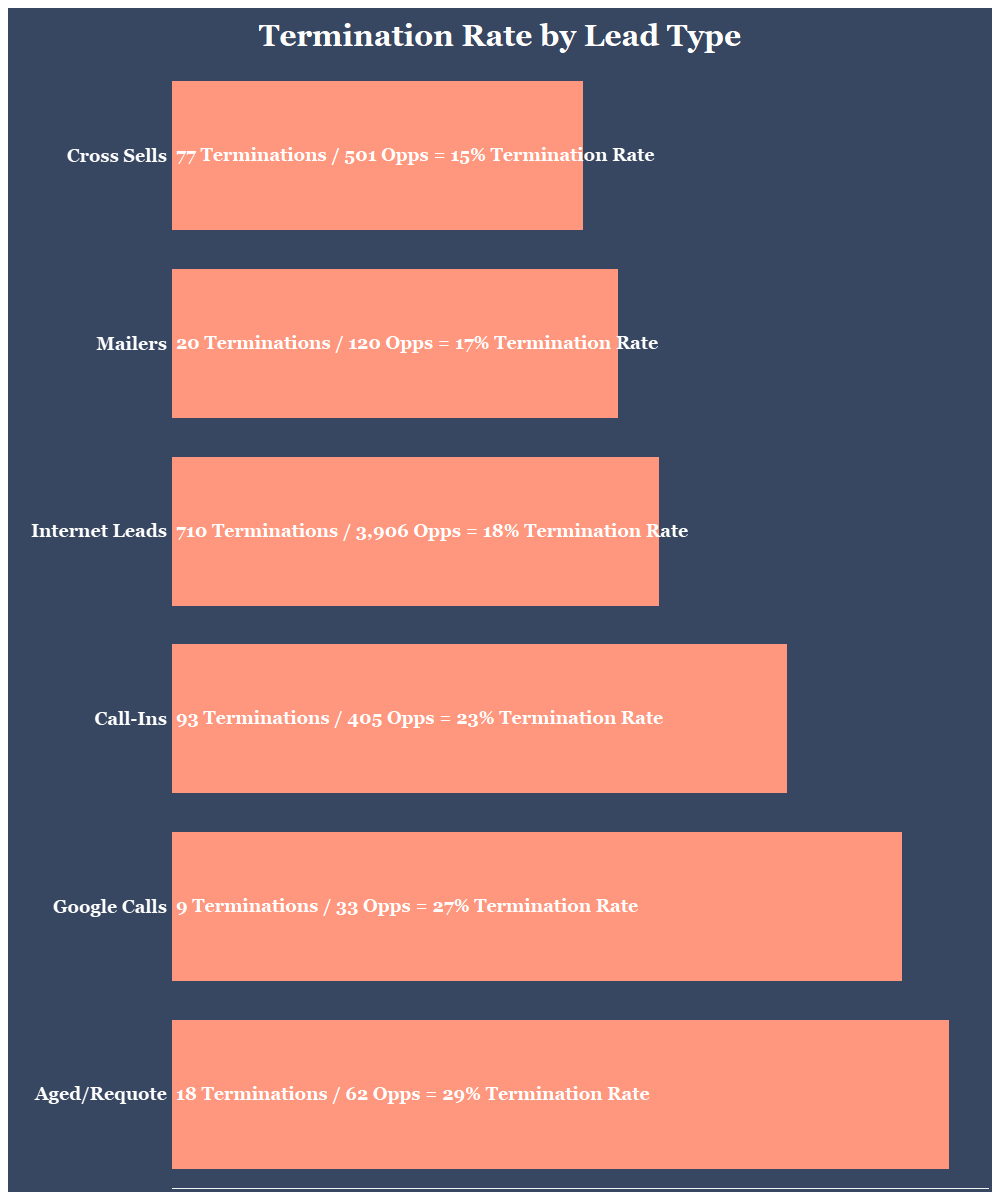 I would have never expected Leads and Mailers to have roughly the same termination rate. To compound the shock, Call-Ins and Google calls retaining at a lower rate than leads was not something I expected (but it makes sense why).